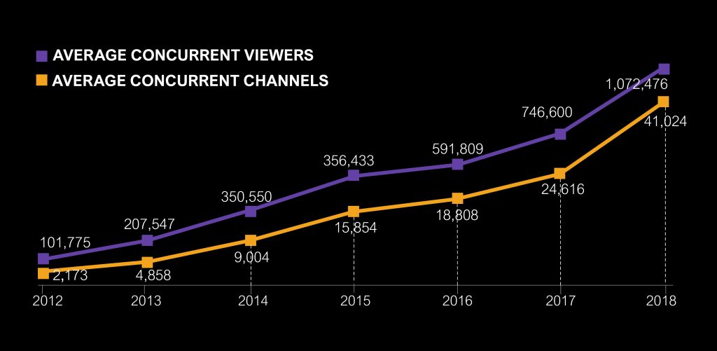 נכון ל-2019, האתר מארח מעל 15 מיליון מבקרים ביום כאשר כל מבקר מבלה בו 95 דקות בממוצע. בשנת 2018 נצפו באתר 560B דקות של תוכן אשר שודרו ע"י 3.4M סטרימרים (שדרנים) ייחודיים, בכל רגע נתון צופים מעל מיליון משתמשים בכ-50 אלף ערוצים שונים, בימי אליפויות ה-E-sports מספר הצופים הממוצע בכל-רגע מזנק ל-4M.
