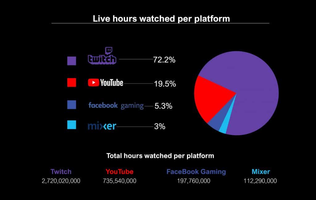 ע"פ דו"ח שעות-צפייה בלייב-סטרים לרבעון השני 2019 של חברת StreamElements (תוכנת שירותי הסטרים הפופולרית-בעולם) זהו הפעם הראשונה שטוויצ' מציגה ירידה, על-אף-זאת, הרבעון הקודם היה החזק ביותר בתולדותייה. יוטיוב מראה צמיחה לעומת הרבעון הראשון, מיקסר של מיקרוסופט גם נכנסה לתמונה ופייסבוק-גיימינג מתבססת יפה במקום השלישי, אולם, הפער של טוויצ' מהן ניכר בהחלט.